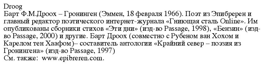 - verscheen op 21 november2000. 2de druk 2013; gratis op DBNL In Benzine neemt Droog de lezer mee op een duizelingwekkende trans-Europa-trip in poëzie, in een opwaartse vlucht van zijn thematiek. Van strandhallucinaties in de Eemshaven en het opzwemmen met zeehonden in de Waddenzee tot hotelbedden in Porto en slagvelden in Rusland. 'Vandaag is het Warschau, dus dit moet woensdag wezen.' ISBN 90-5452077-9; 25 gulden |