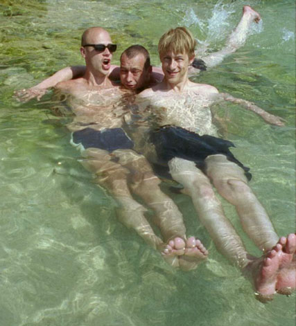 De Dichters uit Epibreren in de waddenzee. V.l.n.r.: Tjitse Hofman, Bart FM Droog en Jan Klug. Duidelijk te zien de grote voeten. Foto: L. van Dalsum